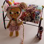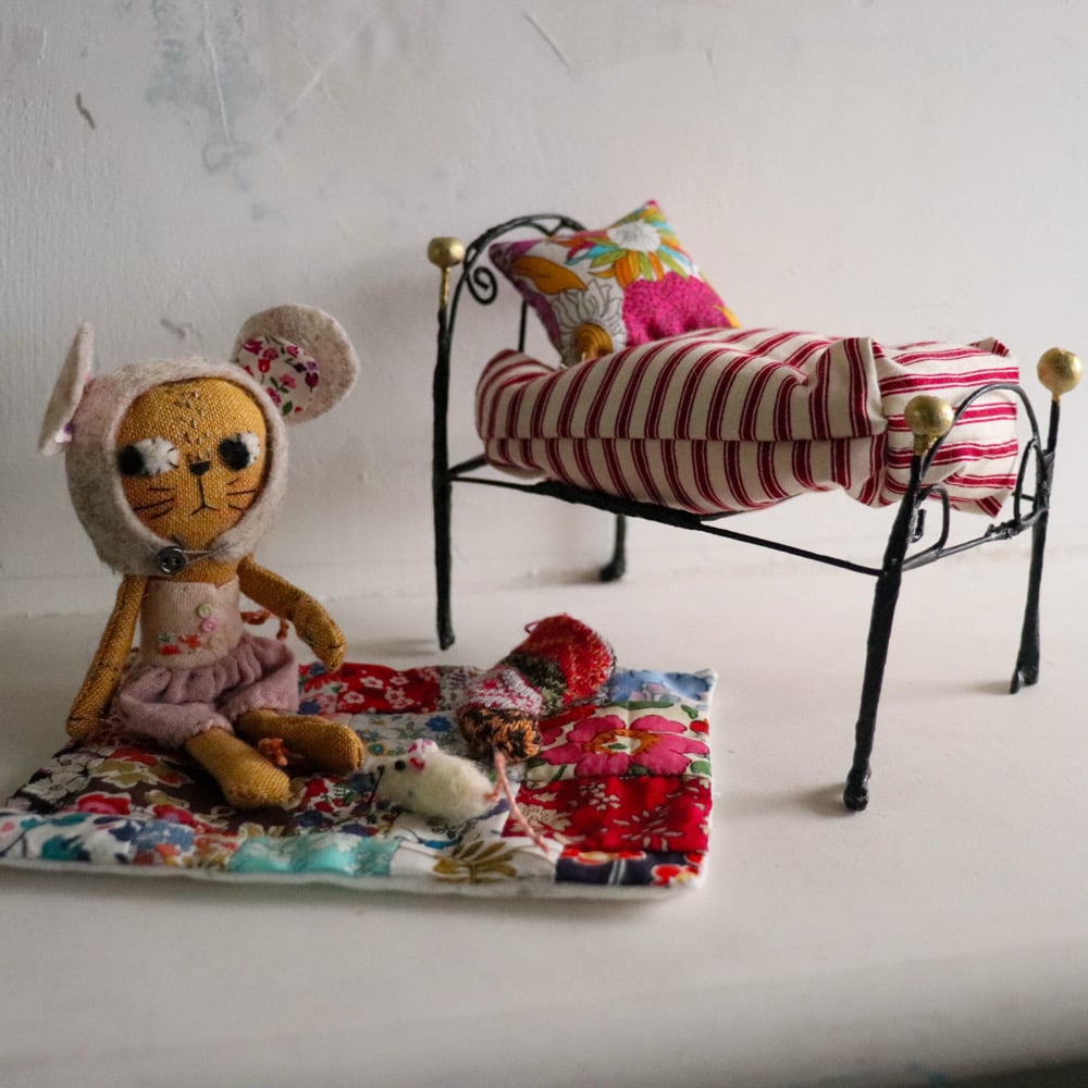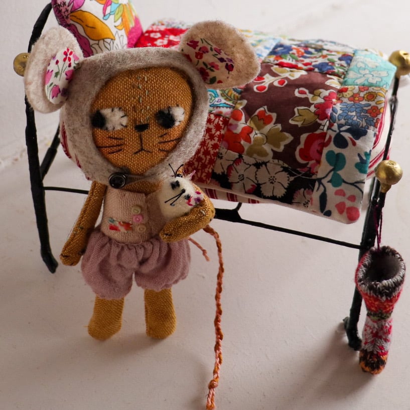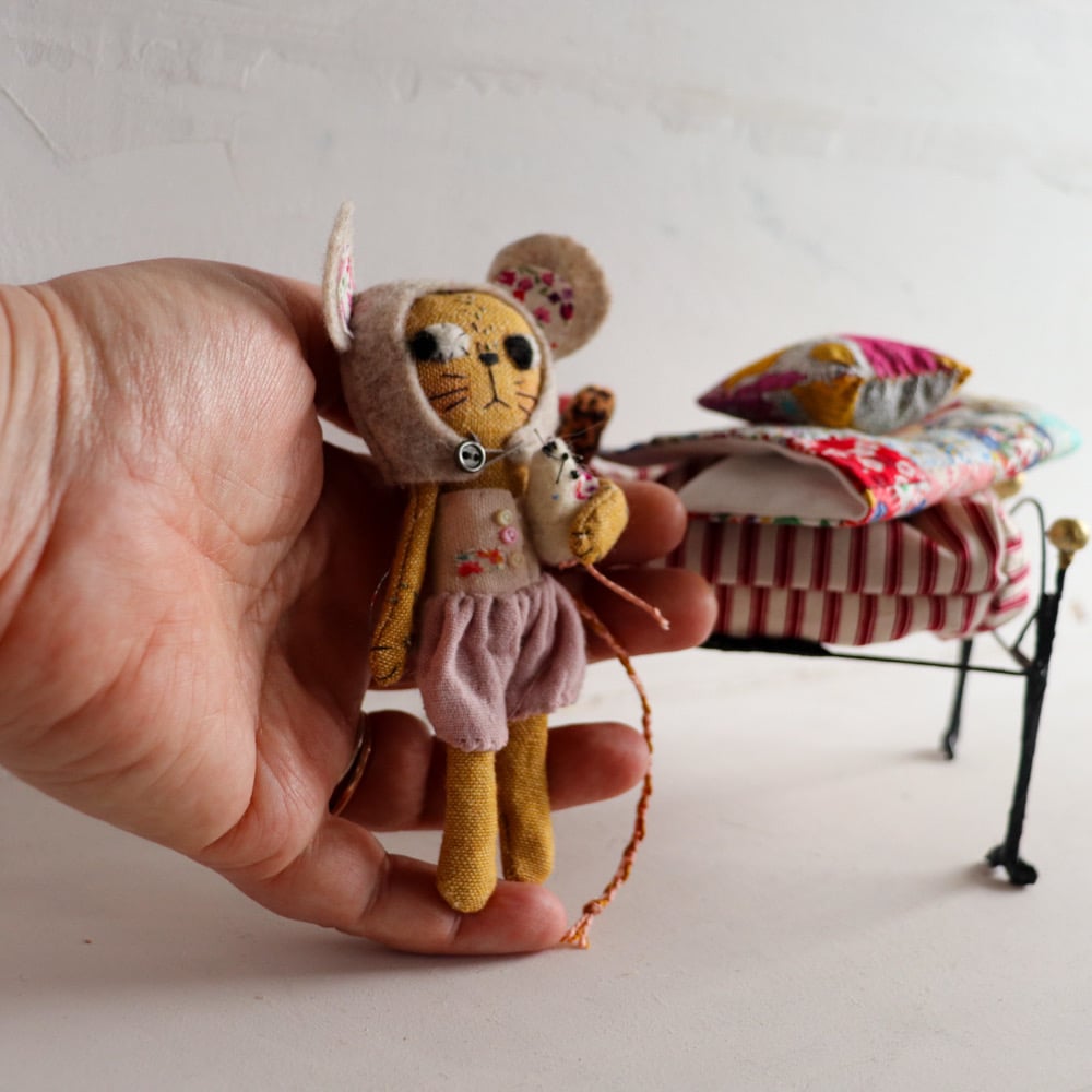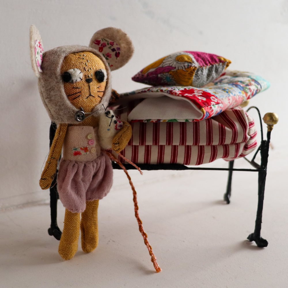 Smidge is a very small Jennie Mouse doll. She is about 4” tall. She is made from linen with waxed linen thread jointed arms. Her limbs are filled with chenille wire. She has a linen waistcoat with tiny buttons and cotton eaffle pants with an embroidery floss tail attached. She has a wool felt mouse hat which fastens with a little button and a loop of shirring elastic. The ears have Liberty scrap linings.