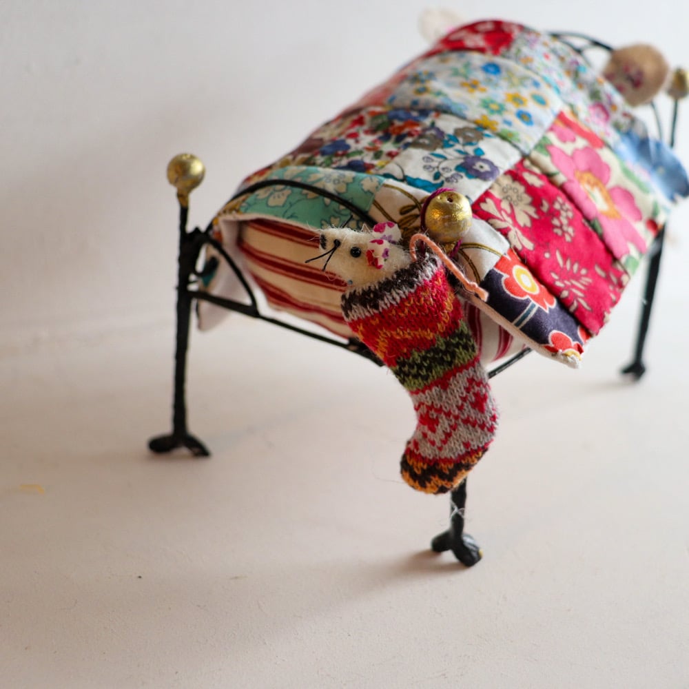 She has a bedding set made from linen, a Liberty fabric patchwork quilt and pillow and a striped cotton mattress.