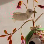 Cathie Larkin has a needle-felted dove on her arm. Both doves have glass eyes and a painted clay beak. The birds can be moved, and the flower stems can be posed.