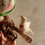 This kitty has a removable wool-felt hat in green. It is blanket-stitched all around, fastened with a little shirring elastic and a button. Delicately handcrafted flower stems sit atop her hat. The flower stems are made from wire wrapped with embroidery thread, with wool felt leaves and petals, with glass beads inside the flowers. A little needle-felted dove sits amongst the flowers. Her hat also has a cotton lace crown, embellished with glass beads.