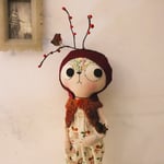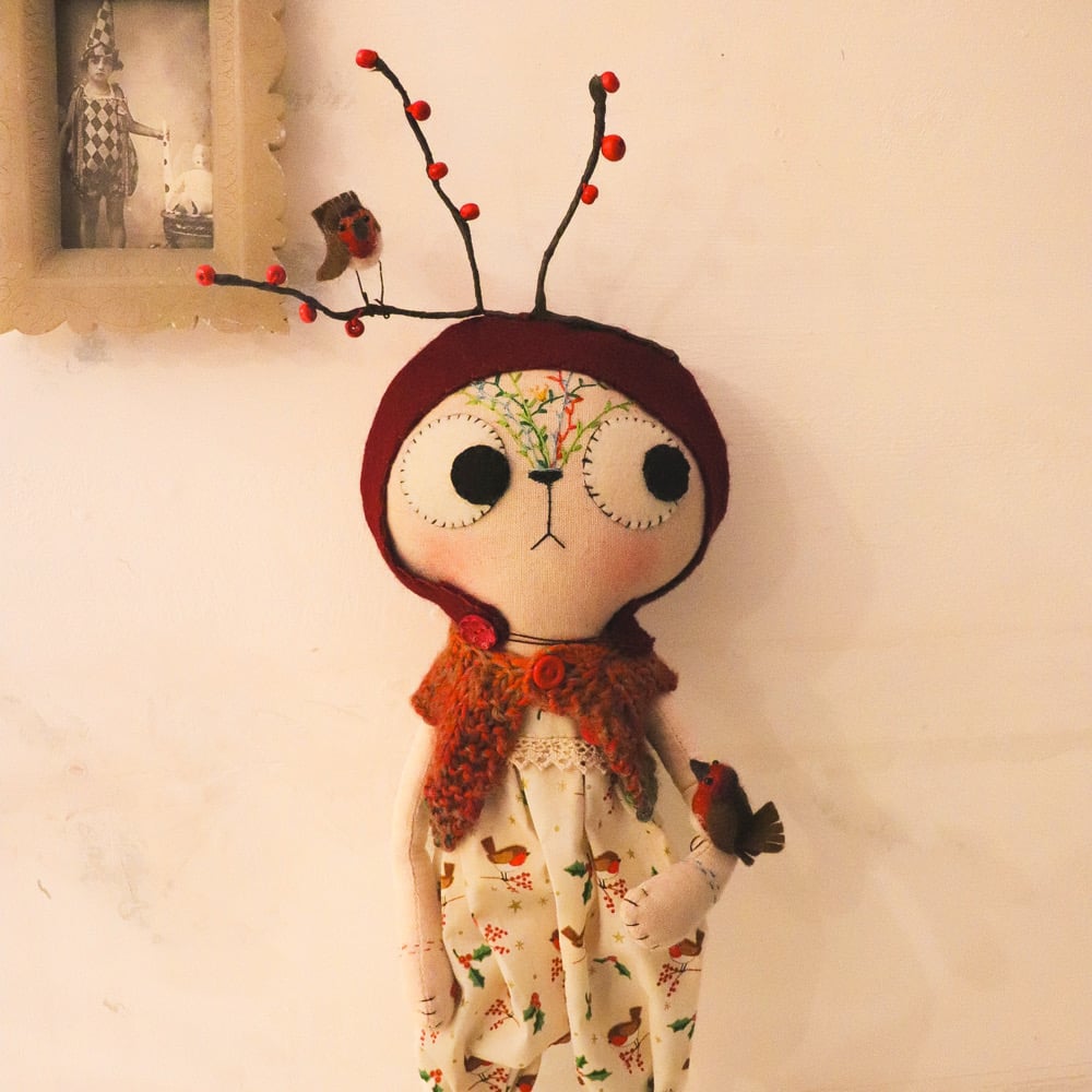 Estelle has another needke felted robin on her arm. This robin can be moved.