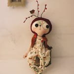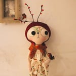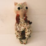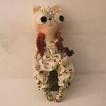 14” cat doll (excluding hat), wired with aluminium wire, and stuffed with wool roving. Beeswax blush to the cheeks. You can remove the clothes carefully.