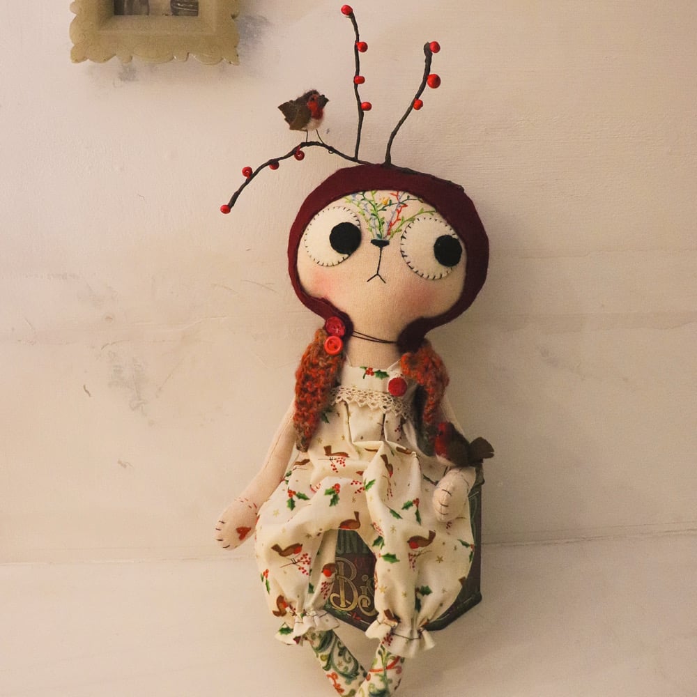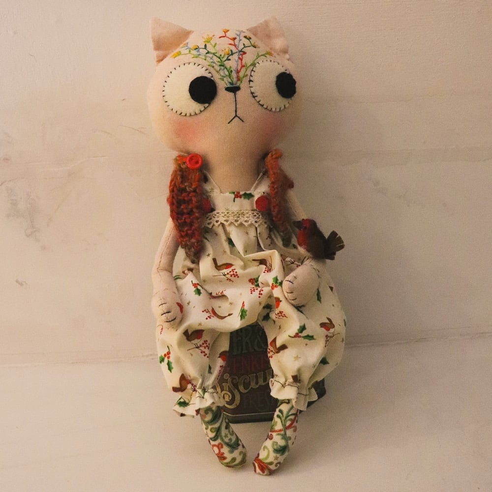 Estelle is a punk blush linen cat with wool felt eyes and hand embroidered details. She has a romper in cotton with a festive print of little robins with gold foil embellishments that matches her legs, and a red ombre handknit skeeveless cardigan with added sparkle.