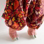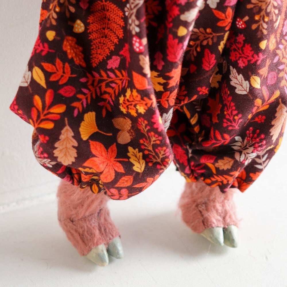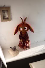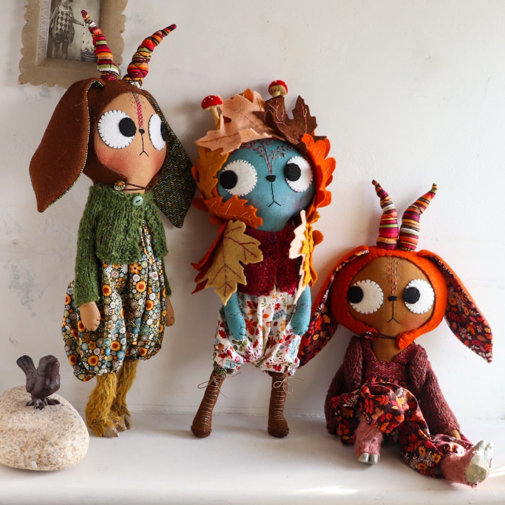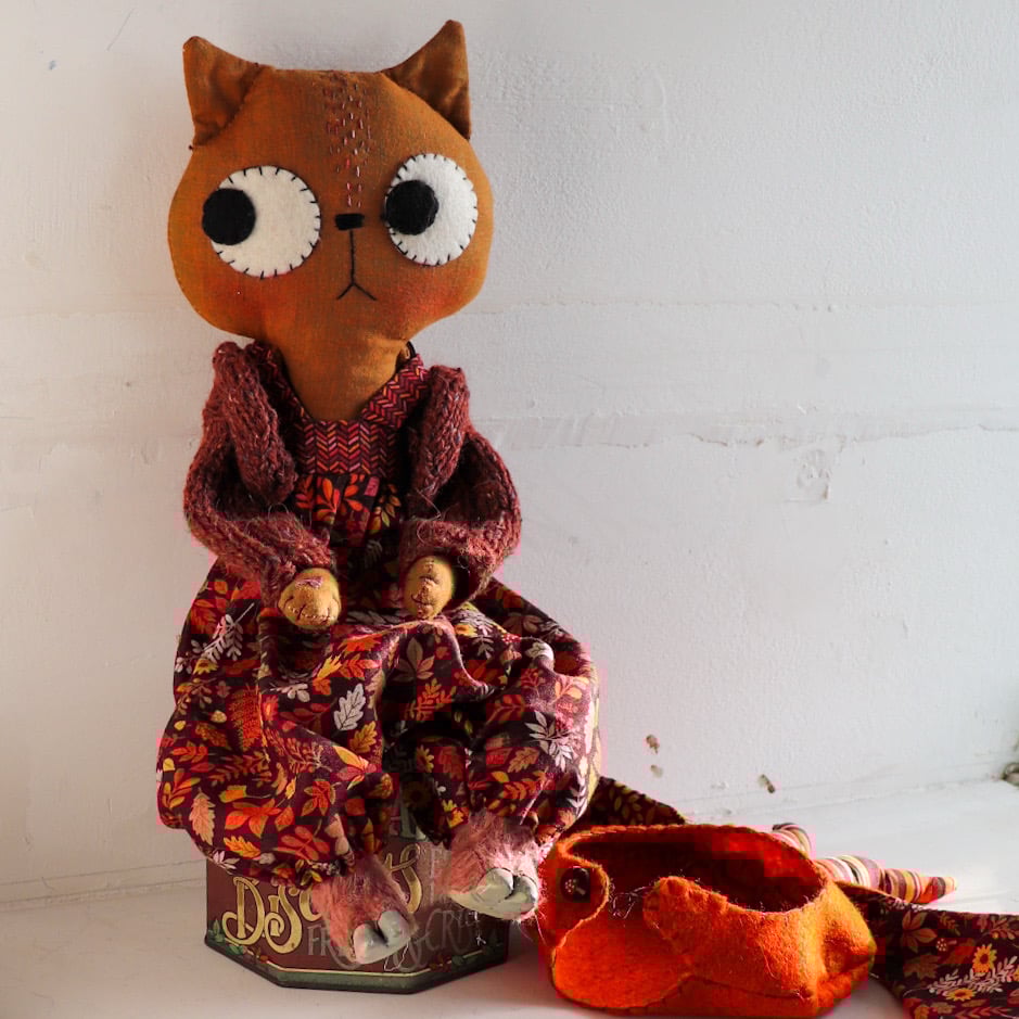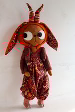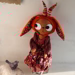 Juniper is a brown kitty made from shot cotton with hand-embroidered details and button-jointed arms. She wears a Quilters cotton romper and a hand-knitted cardigan. Fern also wears a hat with long ears and horns, made from cotton and wool felt. Her legs are made from teddy bear fur. She has hooves made from polymer clay, tissue paper, gouache and varnish The horns are wired and can be posed.