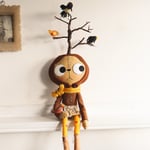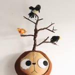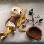 This kitty has a wool-felt hat in chestnut brown. It is blanket-stitched by hand and fastened with a vintage button and a little shirring elastic. A delicately handcrafted little tree, made from wire and paper, hand pained with gouache and drawing ink, which has then been varnished, is stitched atop the hat. The tree has little needle-felted birds roosting in its branches. The tree is wired and can be posed gently.