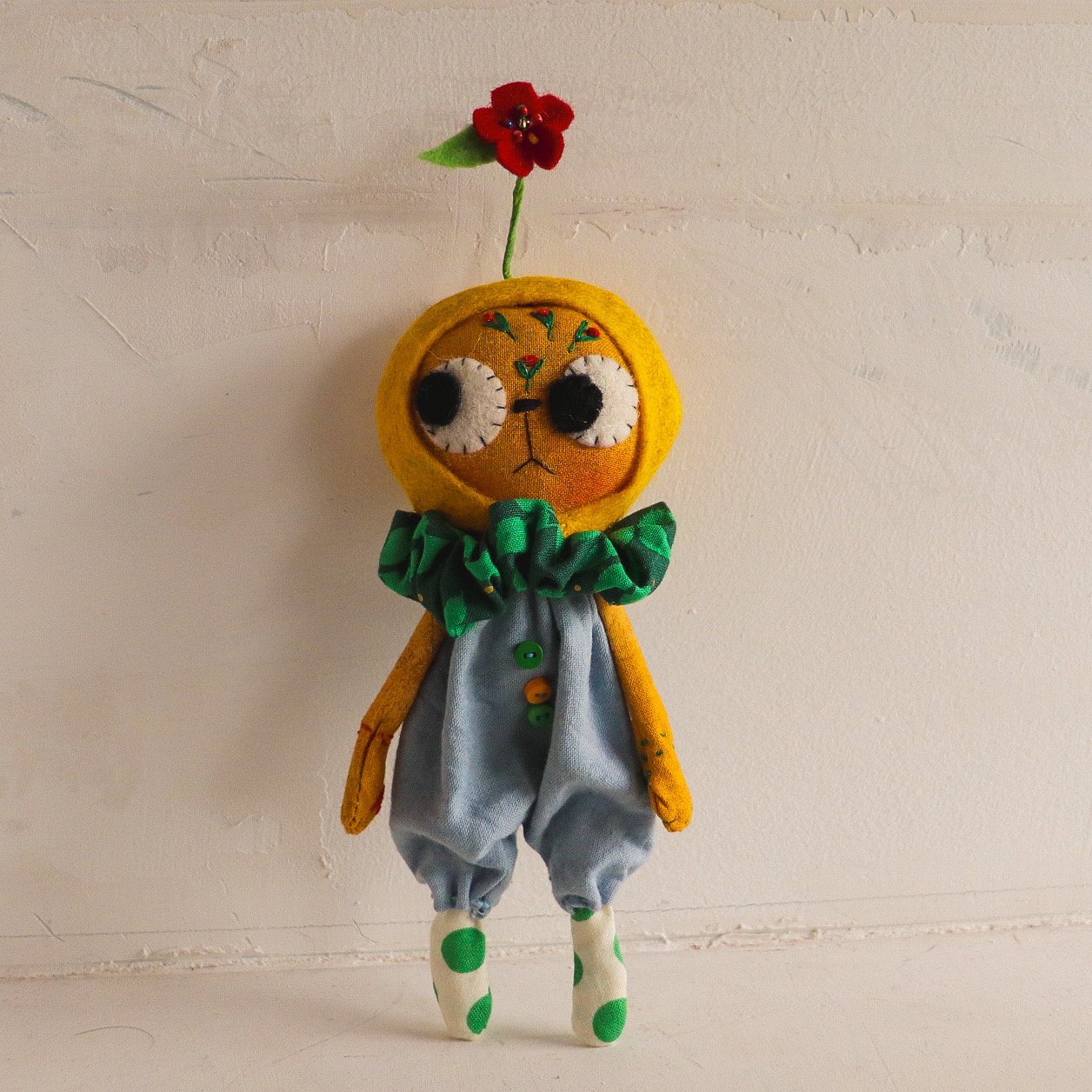 Little Millie is a 7" tiny doll made from Japanese shot cotton with hand-embroidered details. Her clothes are removable. Her legs are made from cotton. She wears a hand-dyed cotton romper with little buttons, a green cotton ruffle, and a wool felt hat with a glass-beaded flower attached.