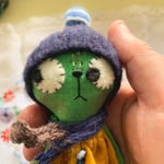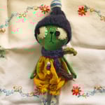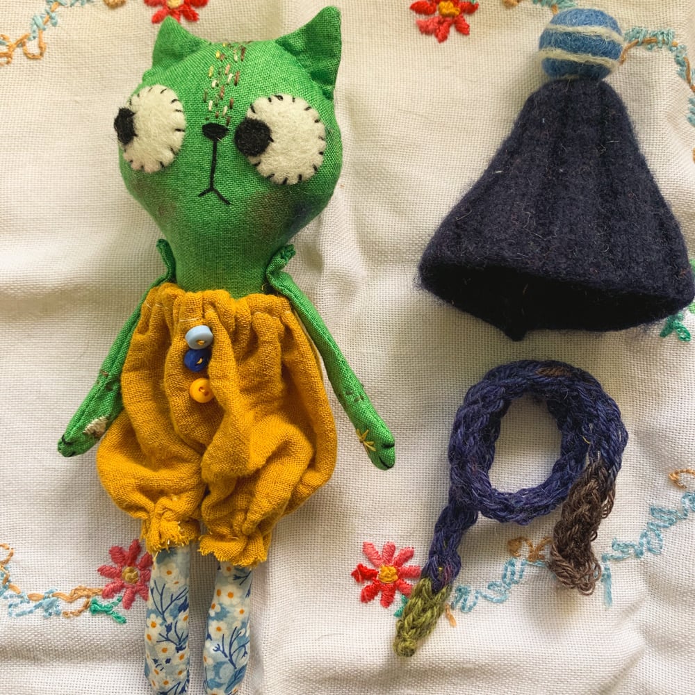 Little Tipp is a 7" tiny doll made from Japanese shot cotton with hand-embroidered details.Her clothes are removable. Her legs are made from Liberty lawn cotton. She wears a waffle gauze romper, a knitted scarf , and a wool hat with a felted ball attached.