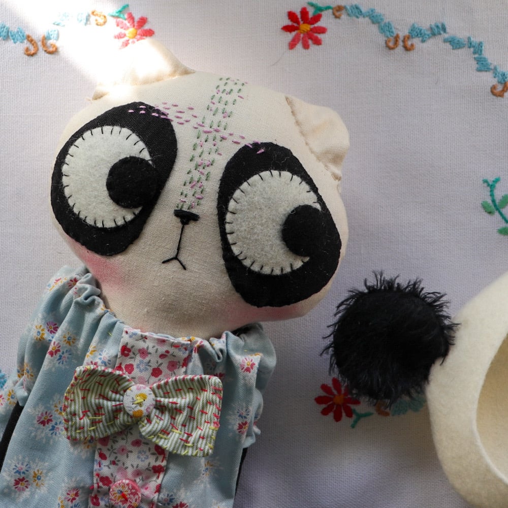 Mochi is a classic 14” cloth kitty doll, beautifully handmade from calico cotton in with hand-embroidered details and needle turn appliqué panda patches. She has button-jointed arms made from black linen. Her legs, made of cotton, coordinate with her dress, which has an embroidered bow, scrap trim and covered buttons. She has coordinating boots made from cotton and linen.