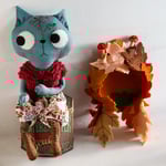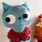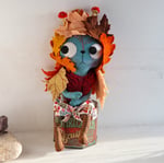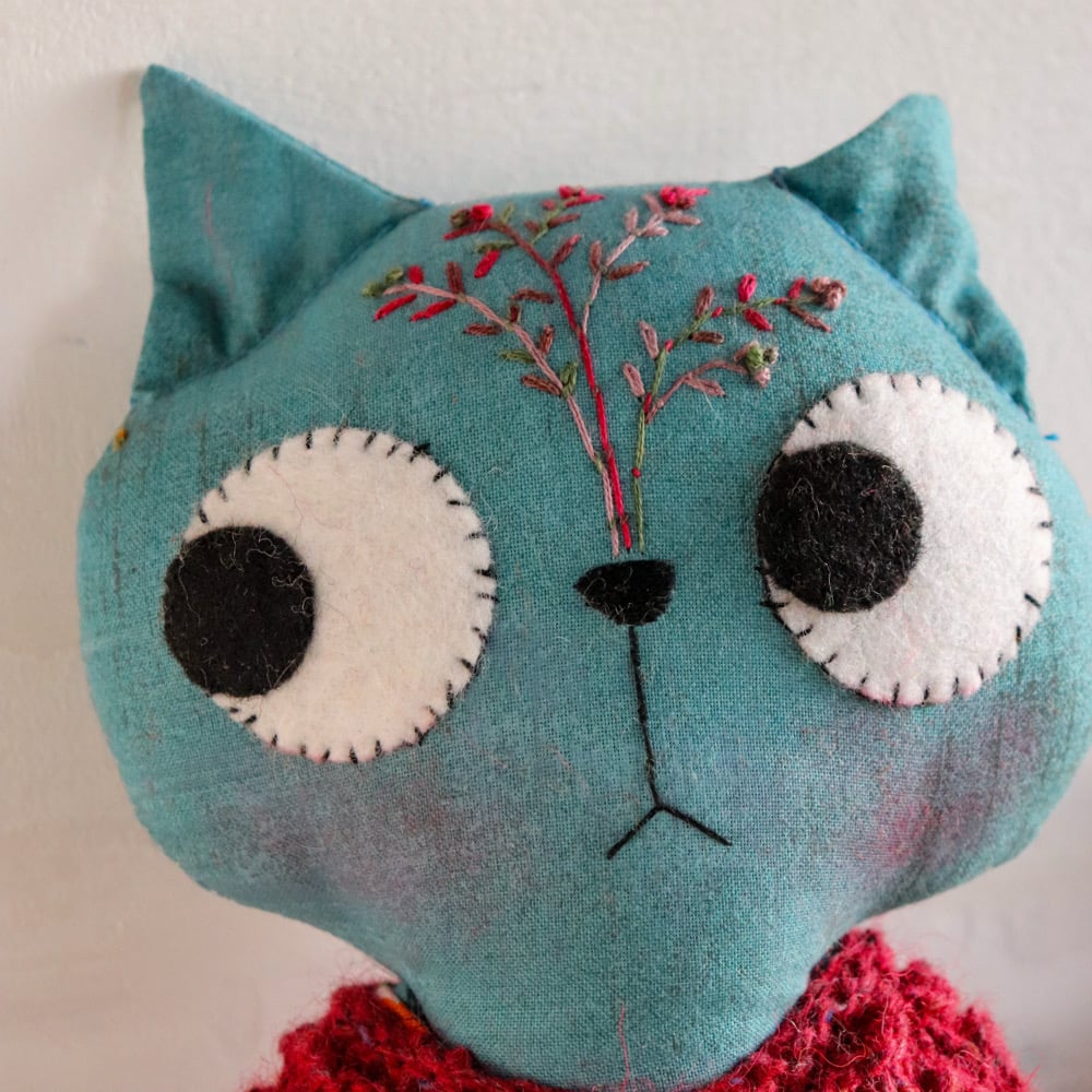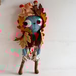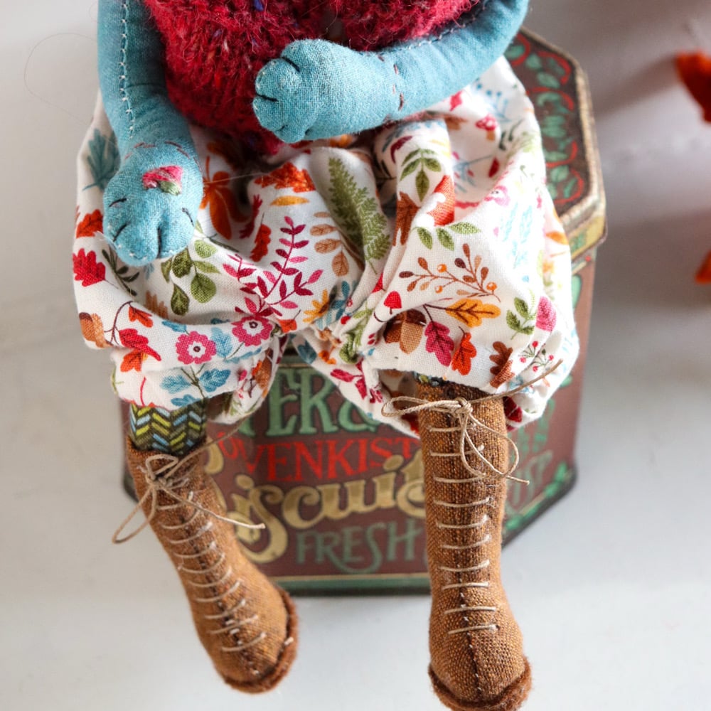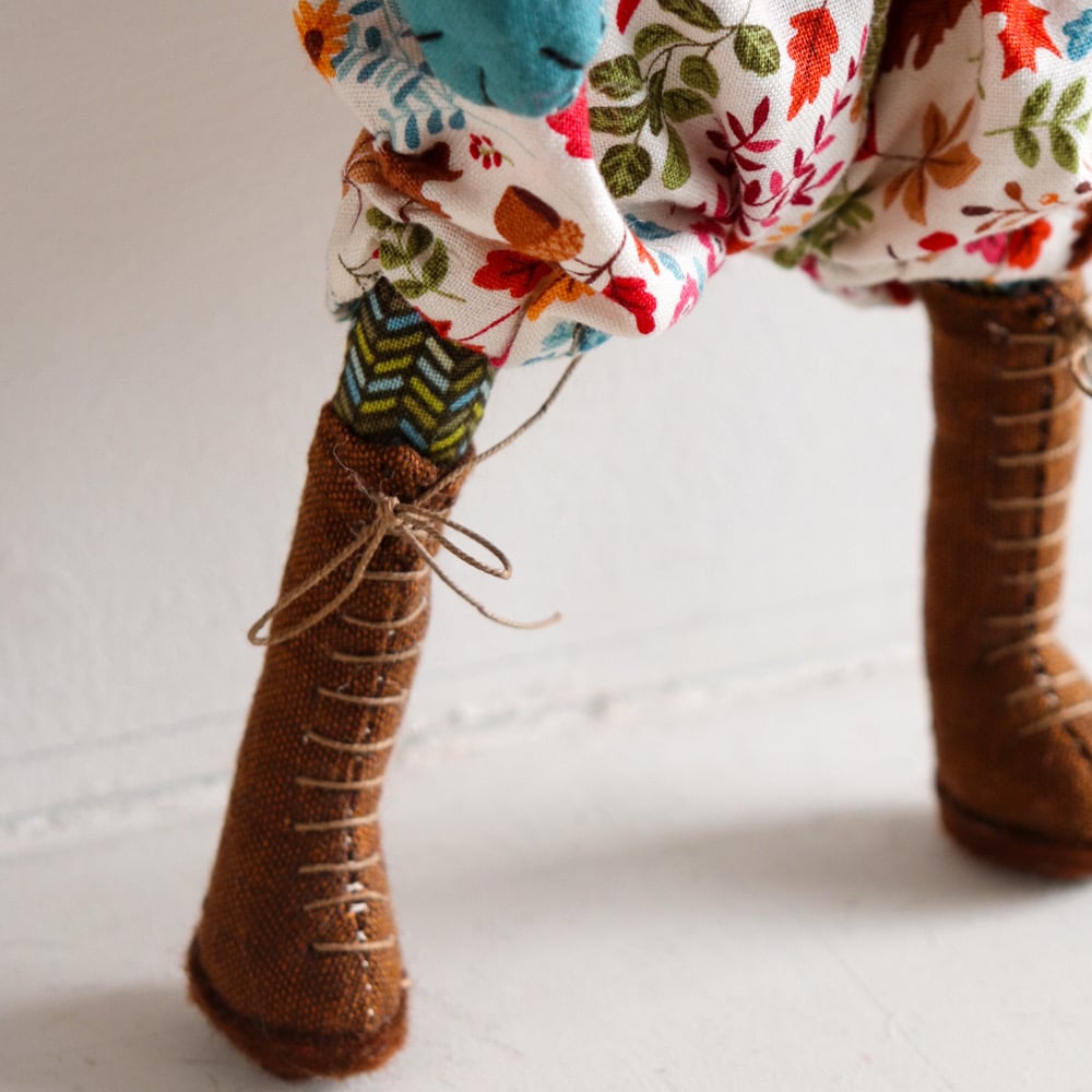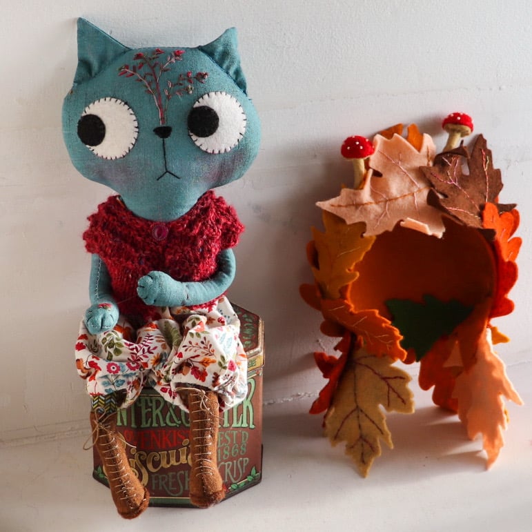 OakenWeld is a blue cat made from shot cotton, with hand-embroidered details and button-jointed arms. She wears a romper made from quilters cotton and a jerkin, hand knitted from arran wool yarn, fastened with a button.. Oakenweld also wears a wool felt hat covered in leaves, and toadstools,, each hand crafted from wool felt, florist wire and hand embroidery. The toadstools are wired and can be posed. She has brown linen boots with wool felt details and linen thread laces.