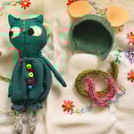Poppy Mouse is a 7" tiny doll made from Japanese shot cotton with hand-embroidered details.Her clothes are removable. Her legs are made from Liberty lawn cotton. She wears a woven linen romper, a knitted scarf , and a wool felt hat with mouse ears attached. Her romper has a little embroidery floss tail attached.