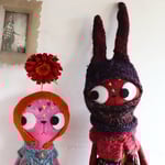 Sweet Mabel is a pink cat made from shot cotton, with hand-embroidered details and button-jointed arms. She wears a romper made from Kaffe Fassett printed cotton and a chunky wool cardigan, fastened with a vintage button. Mabel also wears a hat with a red gerbera stem, made from wool felt. The flower and leaves are wired and can be posed.