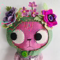Wendy is a pink kitty made from shot cotton, with hand-embroidered details and button-jointed arms. She wears a dress outfit made from cotton with Ricrac trim and cotton waffle bloomers. She also wears a hat with windflowers and Lobelia, all made from wool felt. Each flower is wired and can be posed.